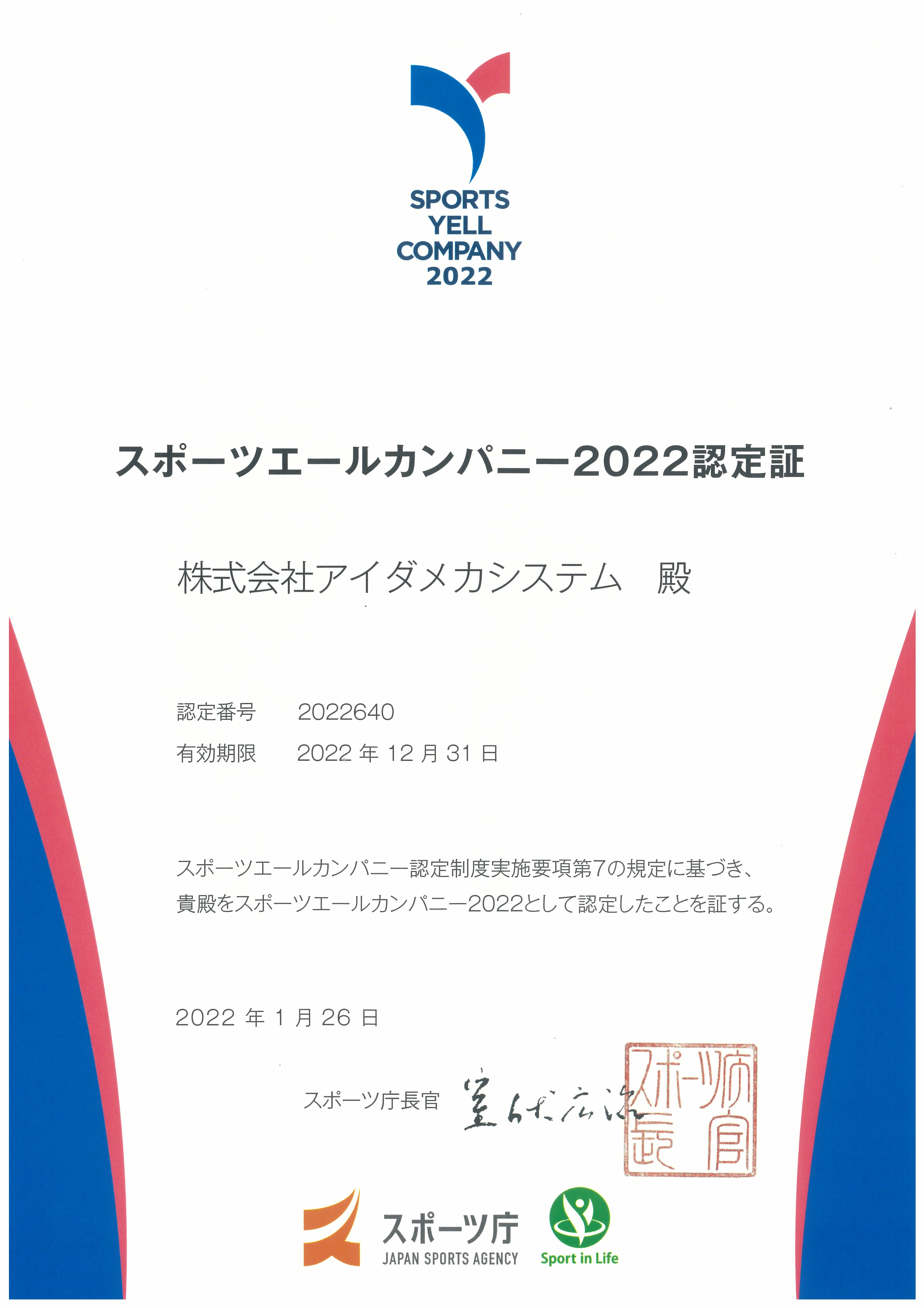アイダメカシステムは「スポーツエールカンパニー2022」に認定されました。