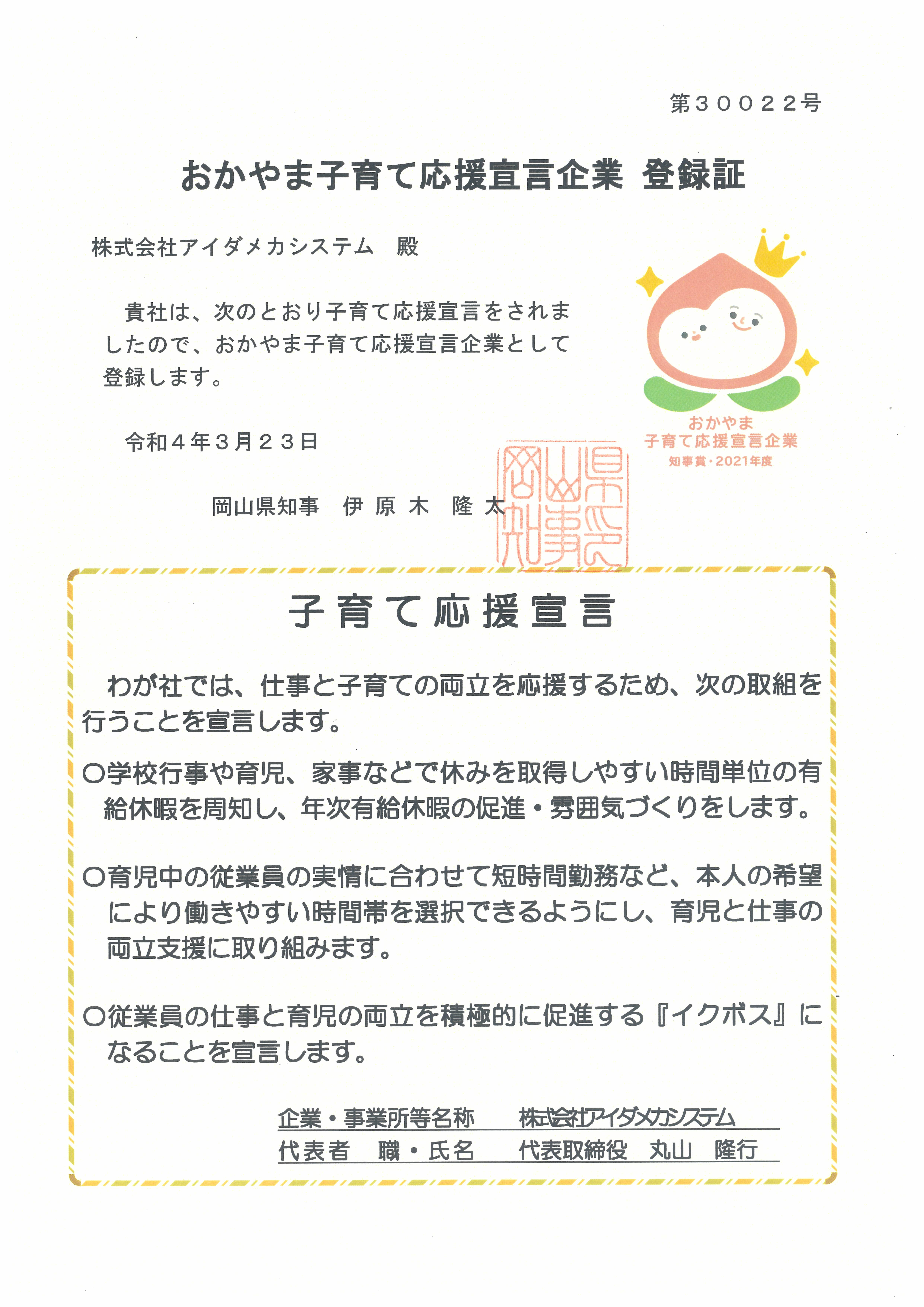 令和3年度 おかやま子育て応援宣言企業 県知事賞