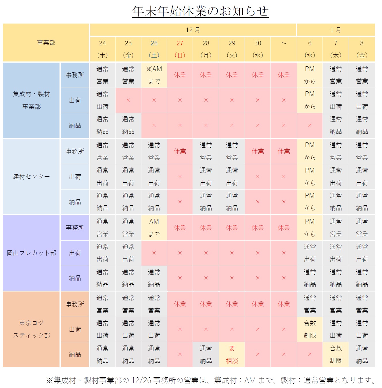 院庄林業では事業部によって年末年始休業の日程が違いますので、ご確認のほどお願い致します。