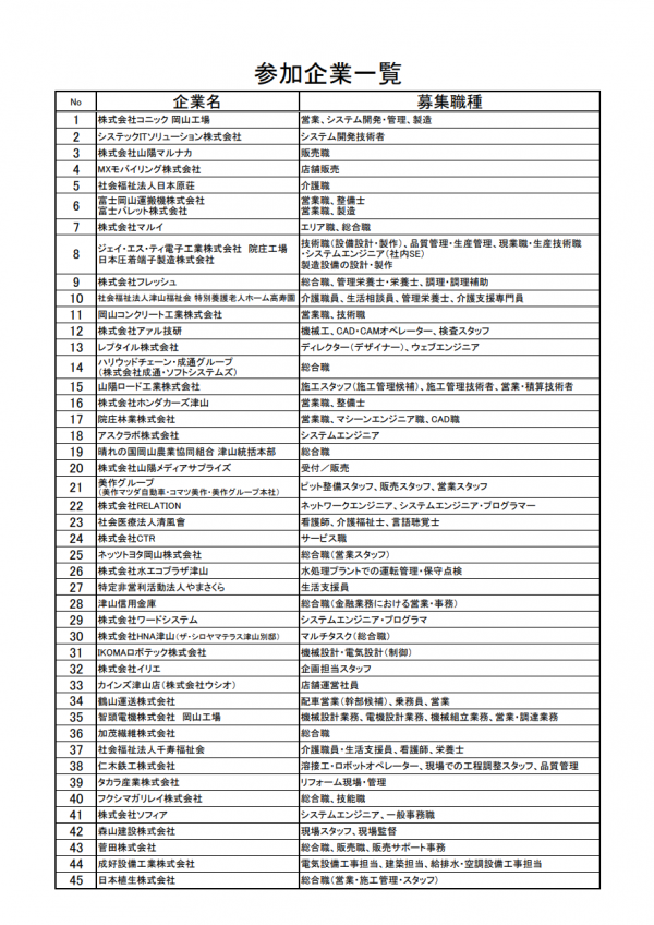 参加企業 | 岡山県北企業45社(予定) 津山圏域合同企業説明会チラシをご覧ください。 |