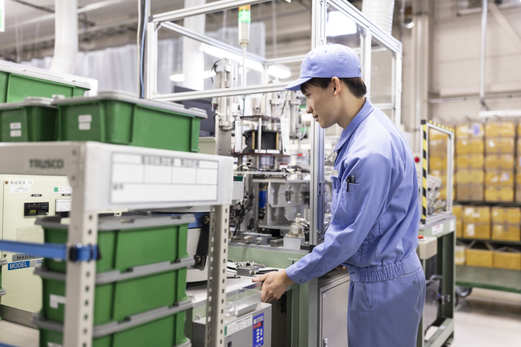 当社の製造工程は大きく設計、原材料から材料を製造、成形、後処理、着磁、製品検査と出荷の5つがありますが、このうち製造ラインオペレーターの仕事は成形と後処理と着磁の工程です。具体的には、以下3種類のマシンがきちんと動いているかを目視で確認を行う見回り業務です。そして出来上がった部品を次の工程へと送る製造ラインのハンドリングをしていただきます。