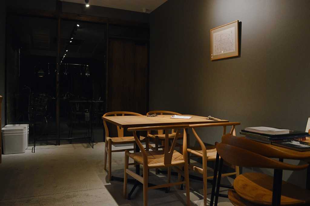 「日進月歩」への入り口は、「KIZOW」の店内にある。先日「KIZOW」に伺った際、飲食スペースは見ていなかったので、私はその空間にまず感動してしまった。一枚板の卓を中心とした、和モダンな雰囲気だ。