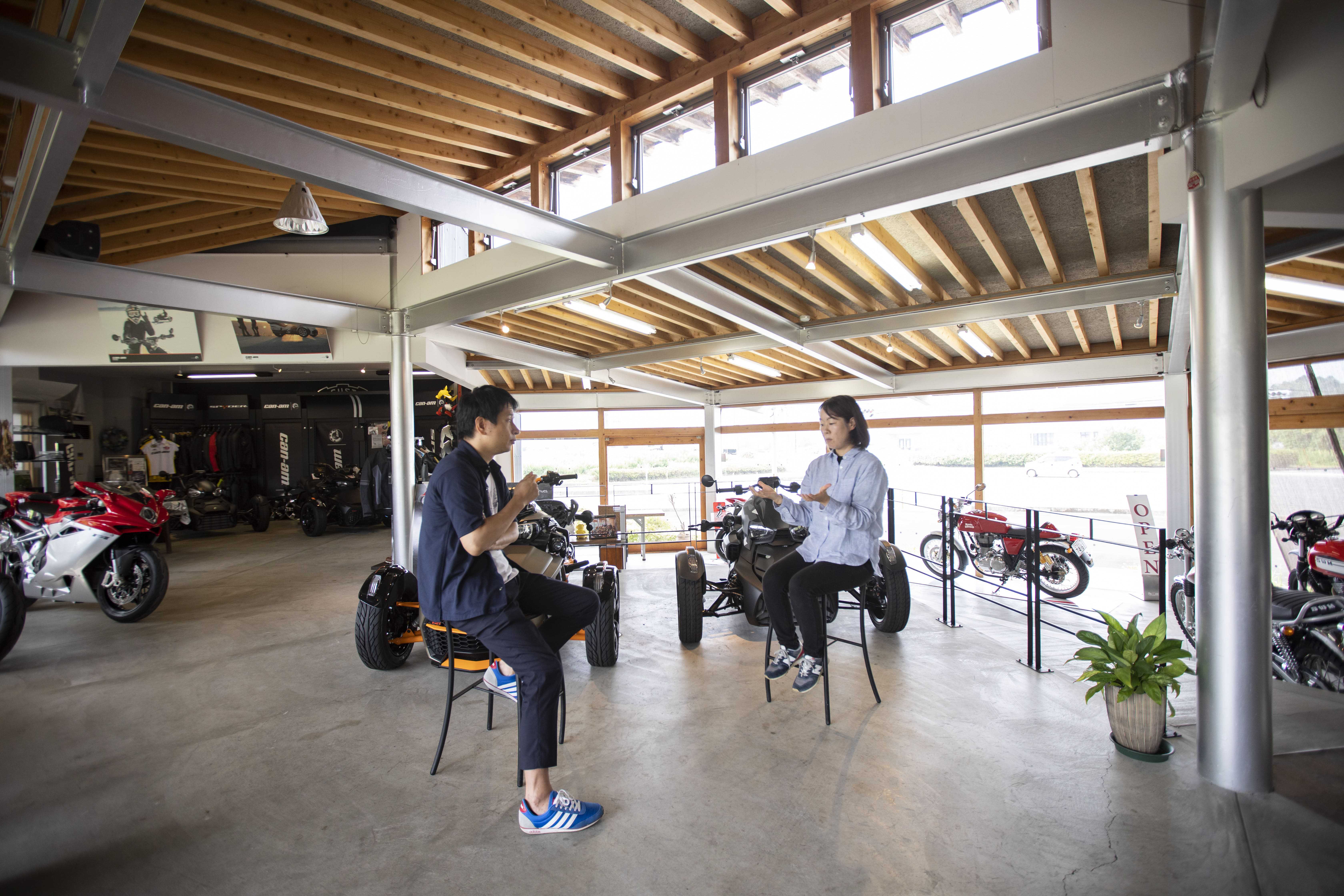 | 丸尾 | 本当にこういうトライク(3輪バイク)とかも、こんなに BRP 社のトライク実物が置いてあるところって、あまりないので、結構やっぱり遠くからもお客さん来られますよね。 |