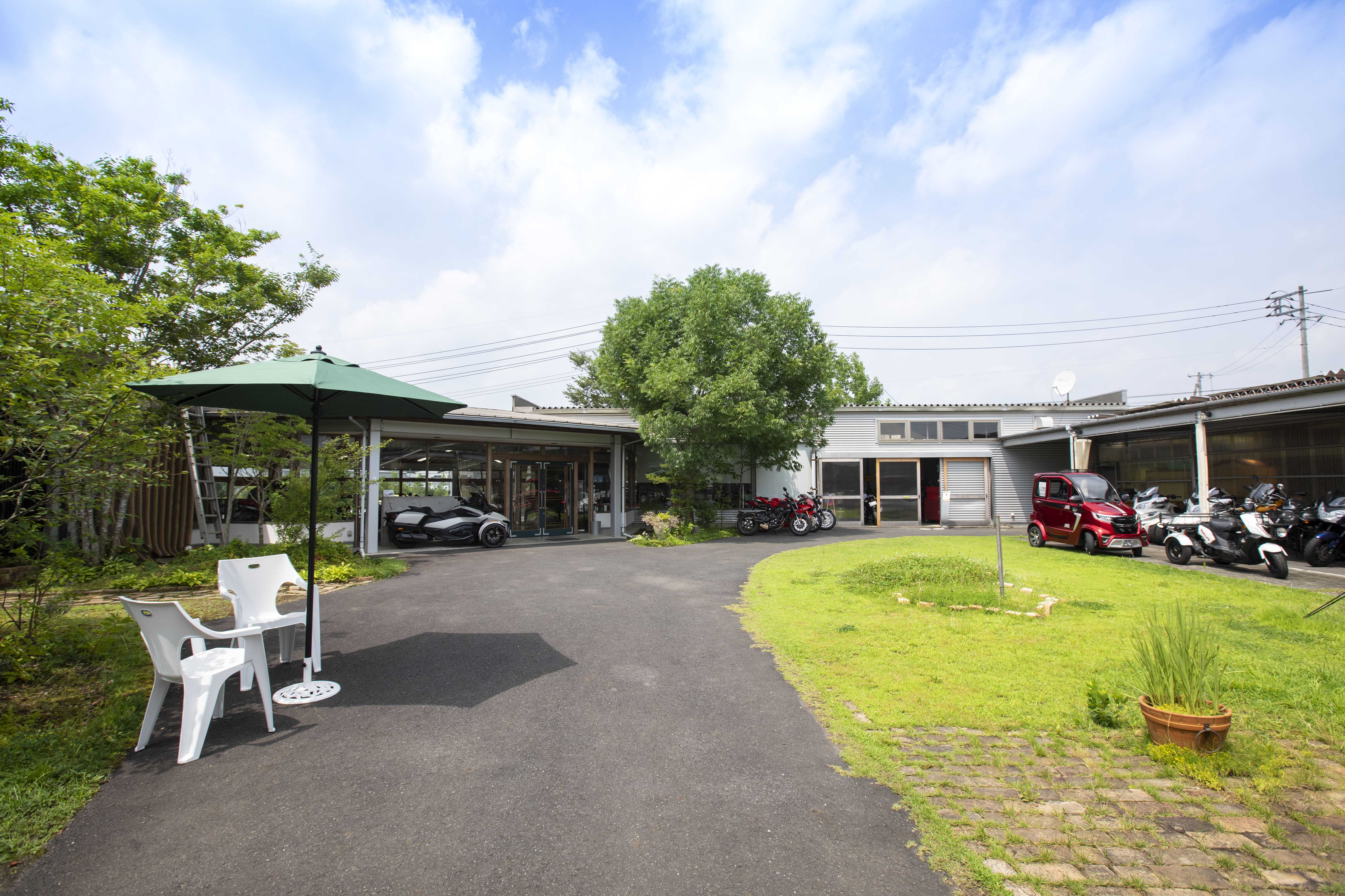 | 岡本 | 15年前にここを建てる時に、交差点側(立地としては表側)を入り口にするのではなく、建物の前の交差点信号に止まったときに、まずバイクで並んでいるのが見えて、その奥に人がいて、その後ろに中庭があって、グリーンがあってという視点でお店作りをしてくださいました。 |
