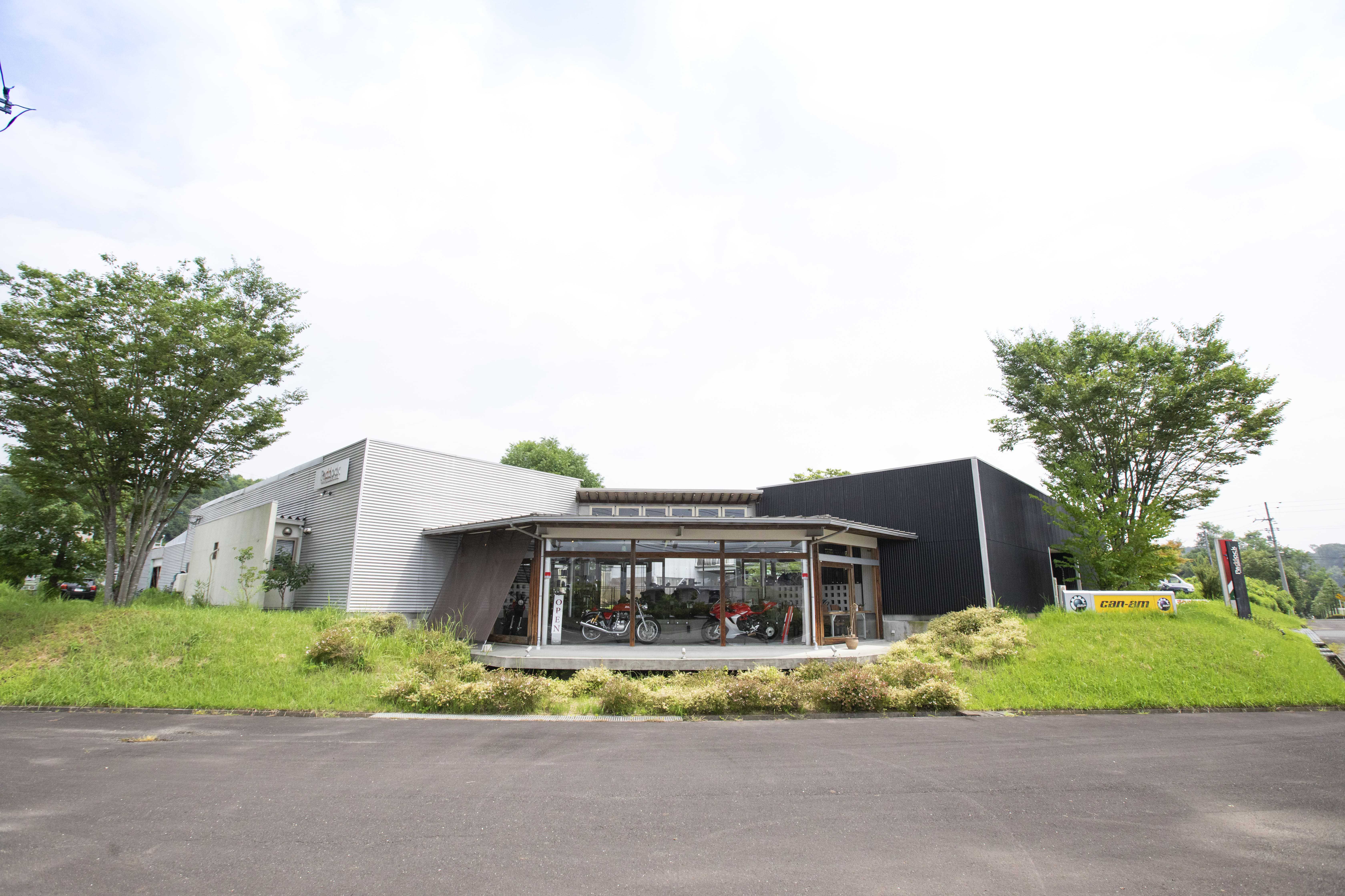 | 岡本 | 遠くから来られたお客様が、時々「どうして津山にあるの?」と言われるんですよ。もっと岡山市など南に出て、同じような店舗を作ったらよかったのにとも言われます。でも津山だからこれができたと思っているんですよ。 高速道路の中国自動車道も近いということもありますし、あと私と、岡本(創業者であり、現在は会長)とか、AKOさん(アコさん。創業から会社を支えてきた専務。)もそう考えているのですが、ヨーロッパとかアメリカに行くと、バイク屋さんは、もちろん街中にもあるんですけど、郊外に大きな店舗があってというところが多いんですね。それはなぜかというと、やっぱり乗り物だから、混雑しやすい街の中をくねくね行ってたどりつくというより、交通量少なく気持ちよく目的地に来て、帰っていけるロケーションが多いんです。 今では、幹線道路沿いではなくても、「パドックさん“に”来たかったんです」、「ここに一度来てみたかったんです」と言っていただけるようになってきました。 |