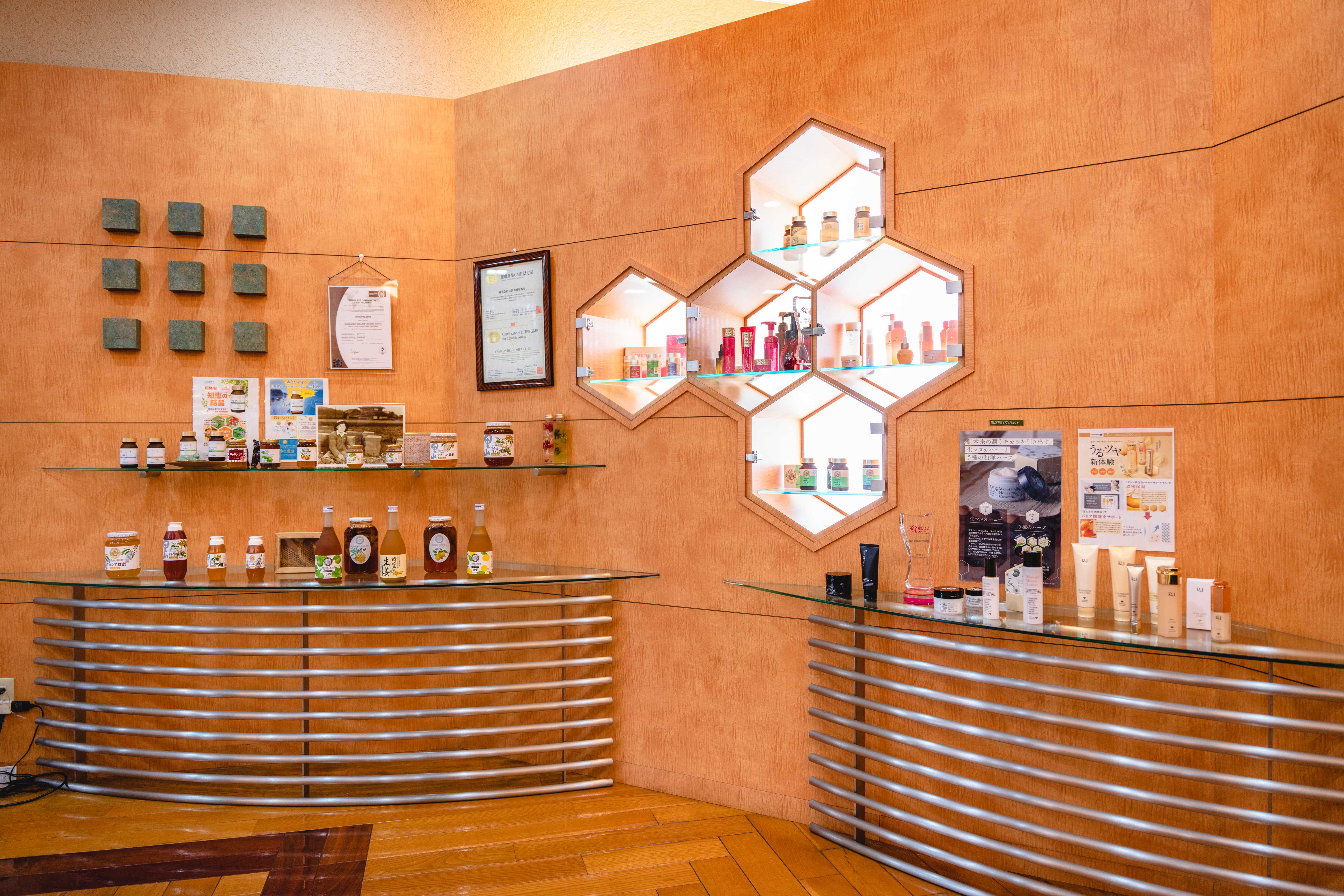 | 本社エントランスに並ぶ、山田養蜂場の商品。蜂蜜、サプリメント、化粧品まで多くの種類がある。 | |