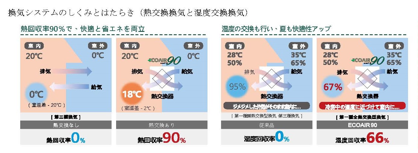 高効率の熱回収と湿度の交換で、室内の快適さはそのままに換気を行うことを可能にし、